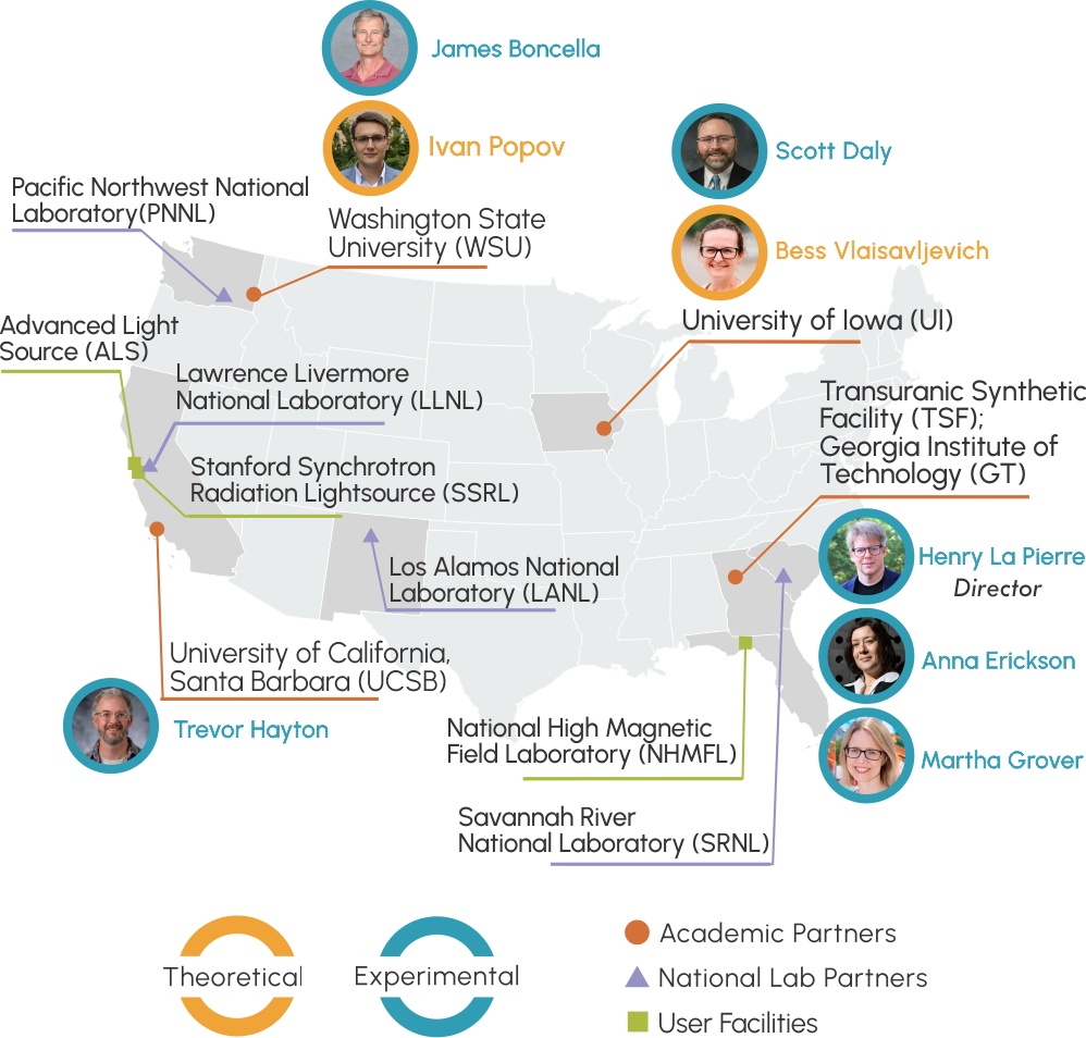 The TRU CoRE spans 8 research groups across 6 universities and includes collaborations with 4 National Laboratories. The team is balanced between synthetic chemists, spectroscopists, engineers, and theoreticians to support the range of techniques and analyses necessary to map the bonding and reactivity of plutonium hydride complexes and redox control of americium separations.